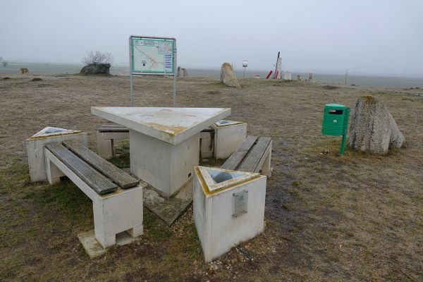 The table is made of wood and is painted in the colours of the three countries' flags. It is surrounded by trees and has a view of the surrounding countryside.