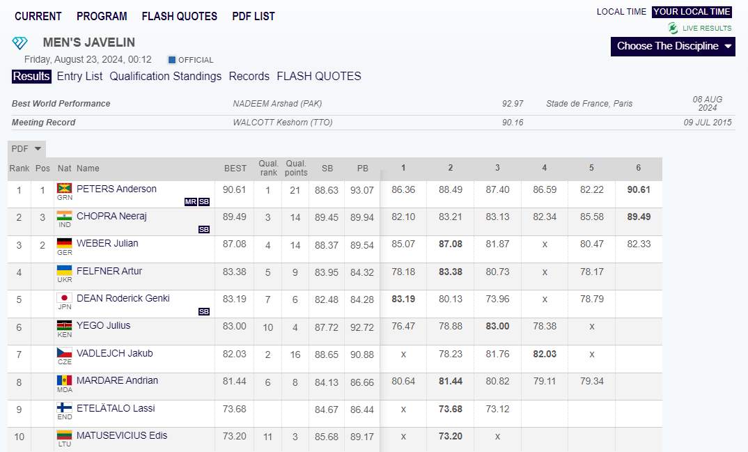 Neeraj Chopra secured second place in the Lausanne Diamond League with a throw of 89.49 m, just behind Anderson Peters of Grenada, who threw 90.61 m to claim first place.