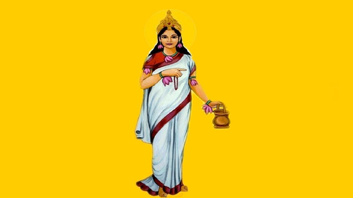 She is depicted as a female deity carrying a rosary bead made of dried rudraksha in her right hand and a kamandalu in her left hand.