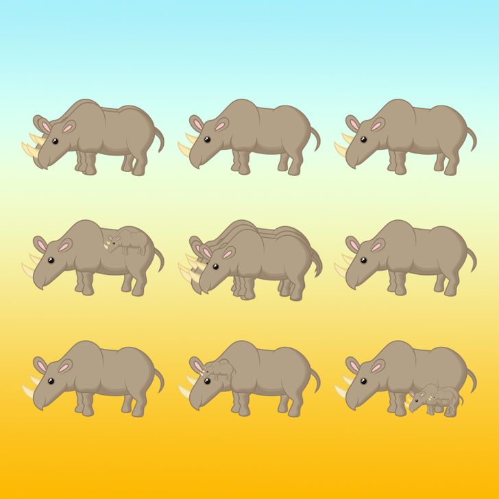 In this brain puzzle, you need to find out the count the total number of rhinos in the picture. At first, you might see only 9 rhinos in the picture. However, there are more rhinos in the picture if you look carefully. In the 1st row, there are 4 rhinos, in the 2nd row there are 6 rhinos and in the 3rd row there are 6 rhinos.
