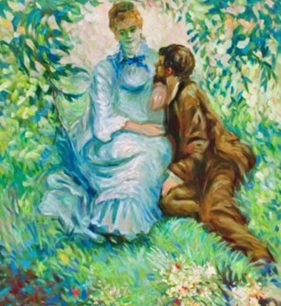 The image shows a couple, a hidden man in the background and a big garden as well. Depending on what the person sees first, one can tell if they are trustworthy or not. It does not mean you are not, but it shows how you are perceived by people around you. So, you can say, depending on what you see first, it can be told if you are trusted by people or not.