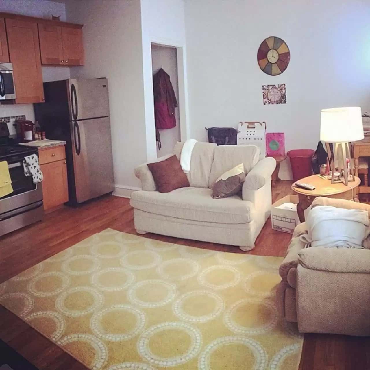 The image shared above presents a living room scene in which you can see two sofas, a carpet, accessories for the kitchen, a refrigerator, a lamp, and other things in the room.