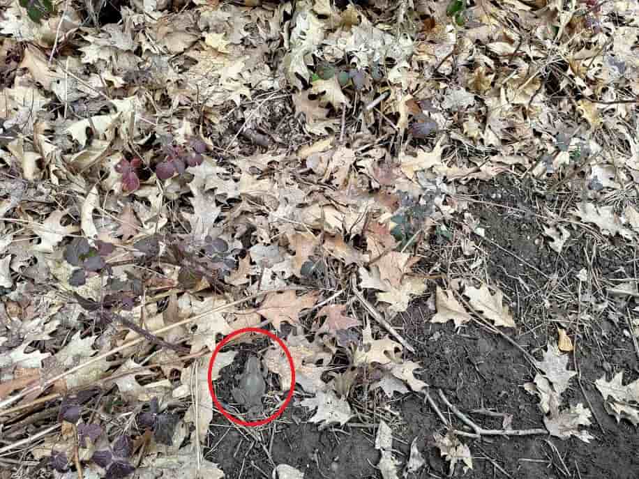 The image shared above shows an outdoor scene in which grass and leaves can be seen scattered. Also seen is moist soil which is ideal for amphibians like frogs to hunt for food like insects, ants etc.