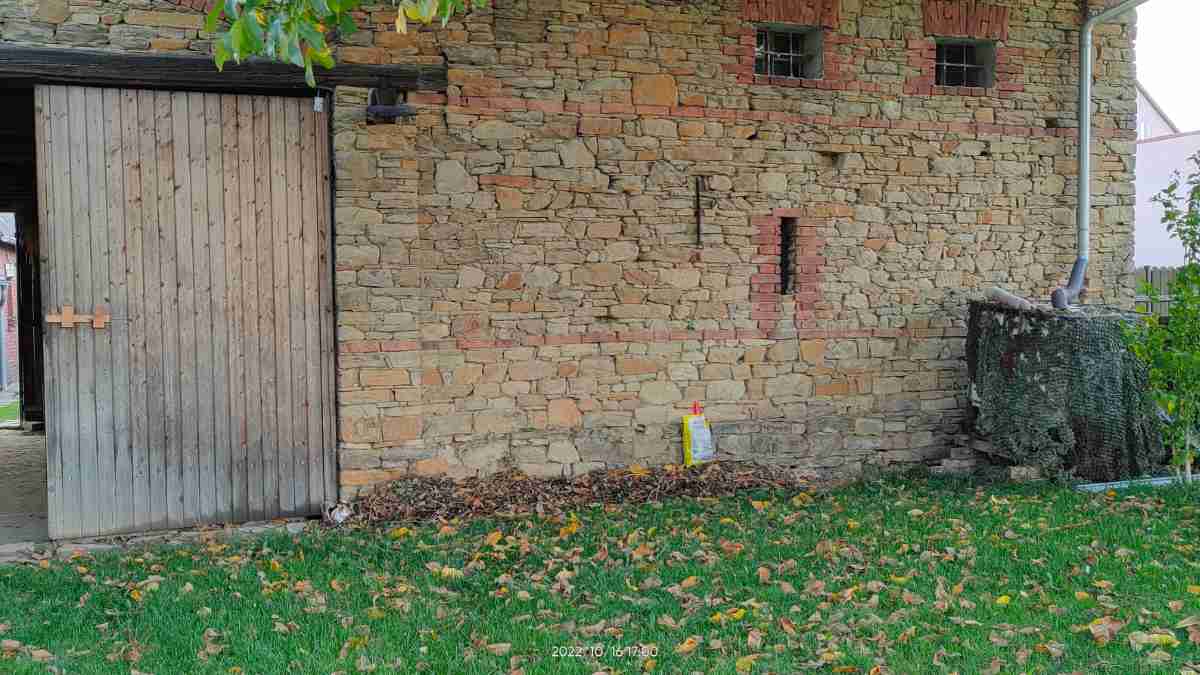 This image was shared on Reddit and you can see that the image depicts a backyard of a farmhouse where leaves are scattered.