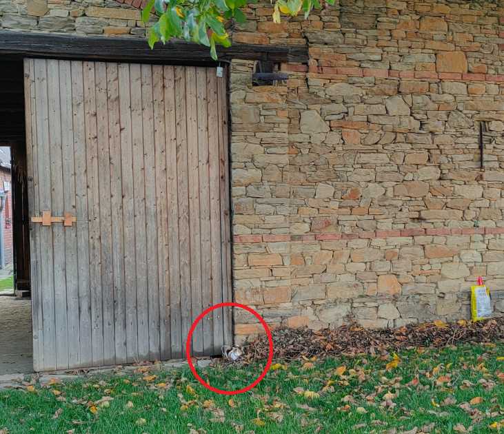 As you can see Coco the cat with fur of black, ginger and white colour is sitting pretty tucked against a heap of leaves just near the door on the left side of the image.