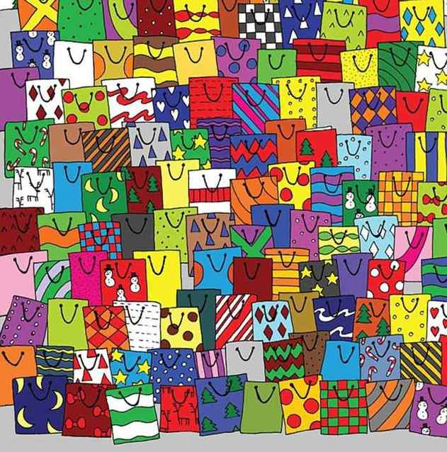Based on the festive theme, here is an optical illusion challenge where the readers are asked to spot a greeting card hidden among the gift bags.