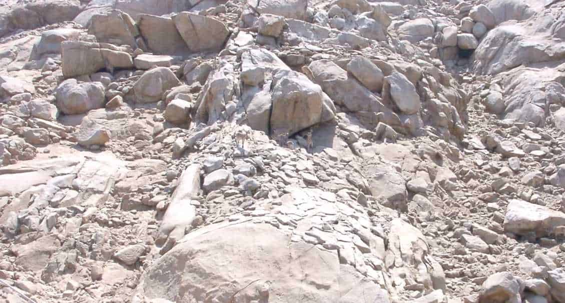 A rocky hill with boulders of rocks scattered across the area is seen.