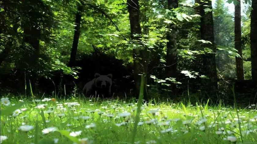 The image shared above depicts a forest scene with flowers and trees, where a bear is hidden in plain sight.