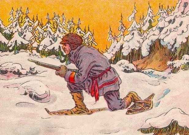In the image shared above, a hunter with a rifle in hand can be seen crouched in a snow clad valley.