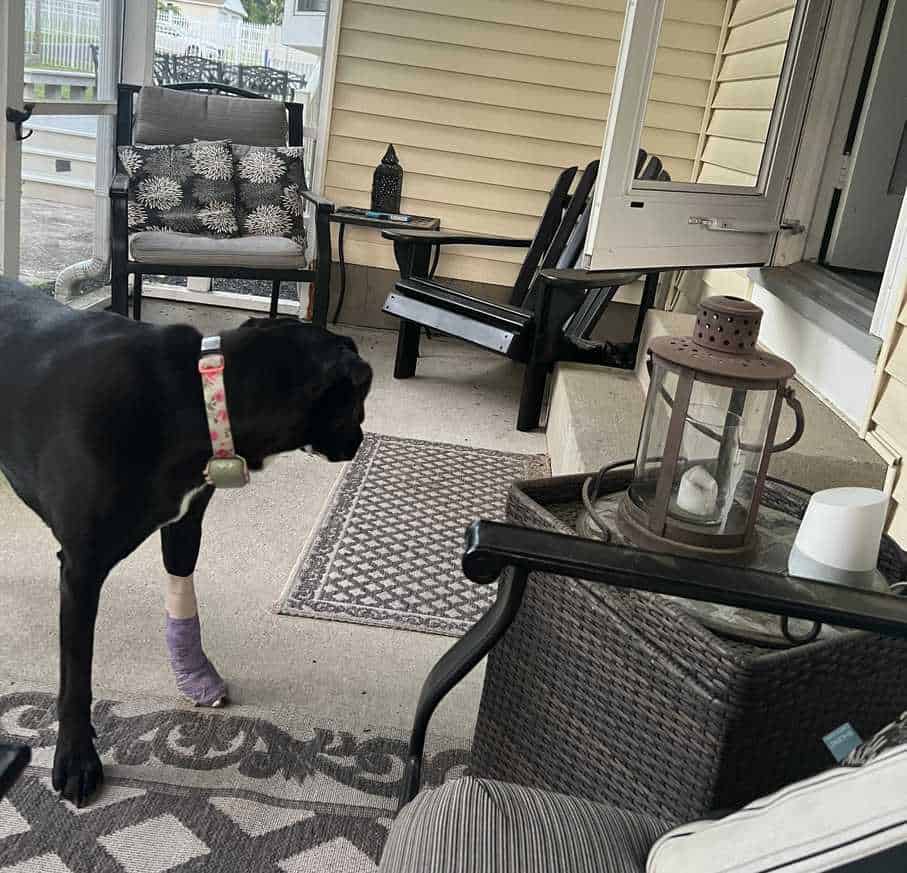 In the image shared above, a patio scene is depicted, where different types of seating arrangements can be seen. A dog with a bandage on its leg is also seen. The dog is not alone; there is a cat in the picture. Can you spot the cat in 11 seconds?