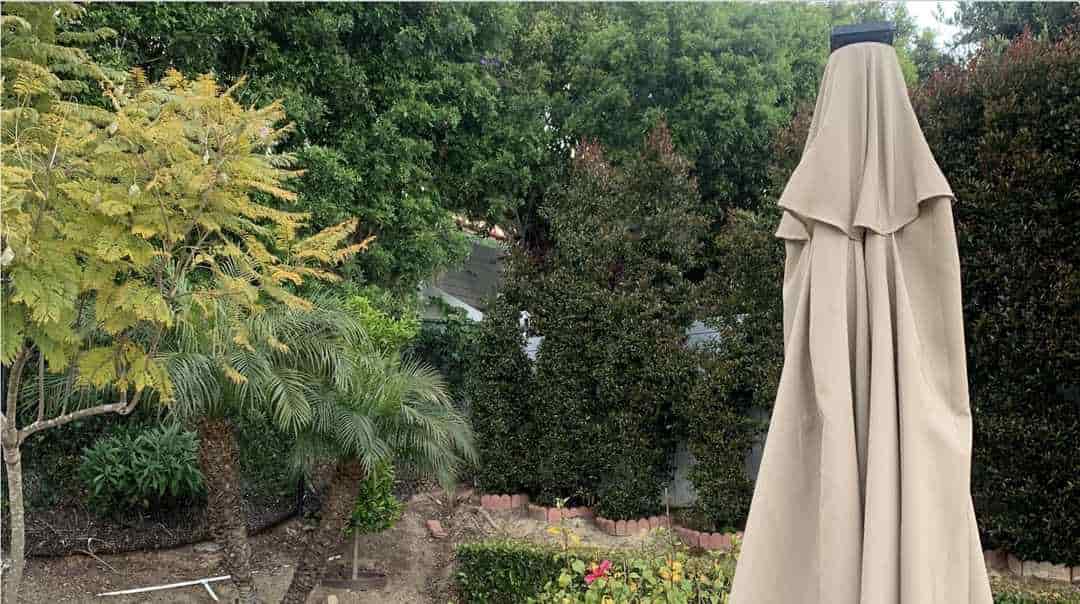 There are two small palm trees among the greenery, a table with chairs and big umbrella for providing shade, dried leaves, etc.