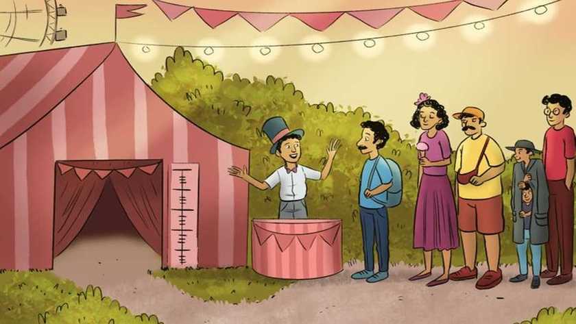 In this image shared above, a carnival scene is depicted where people have lined up for watching a magic show.