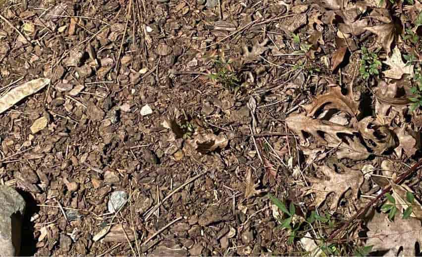 Various small plants, dry twigs, and leaves can be seen scattered around the area.