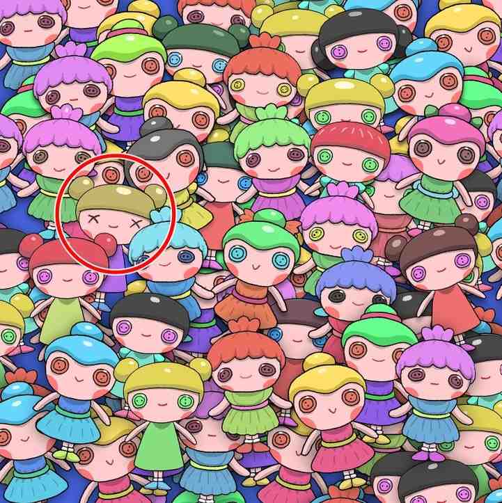 Take a close look at this optical illusion image and try to spot the hidden odd doll among the colourful dolls. It may appear too tricky to find the doll, but if you look at the center-left side of the image then you will be able to spot the odd doll. The doll without the button eyes has brown hair and is wearing a purple dress.