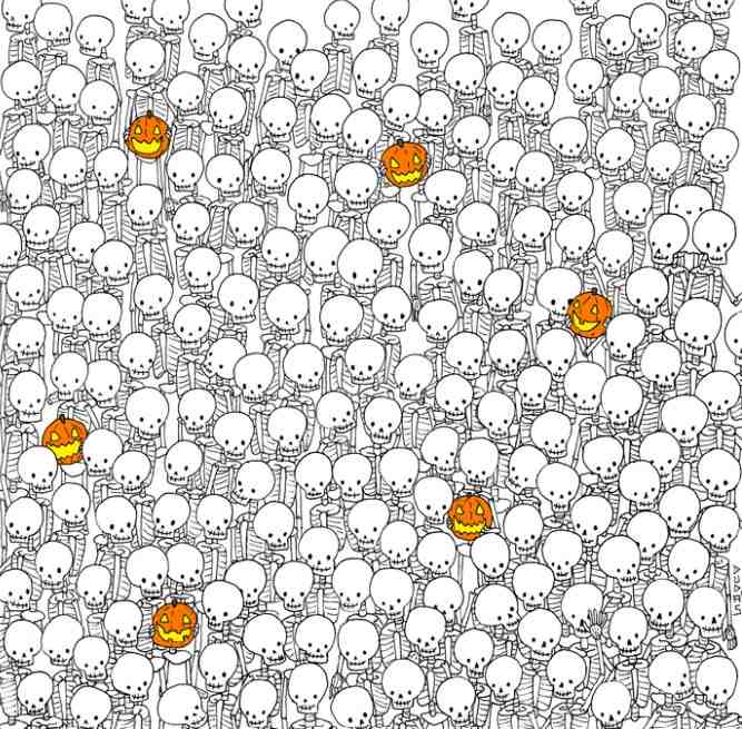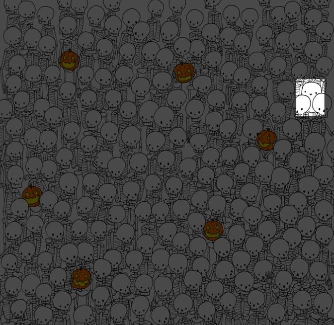 Optical Illusion for IQ Test: Spot Ghost Hidden Among Skeletons In the Halloween Picture