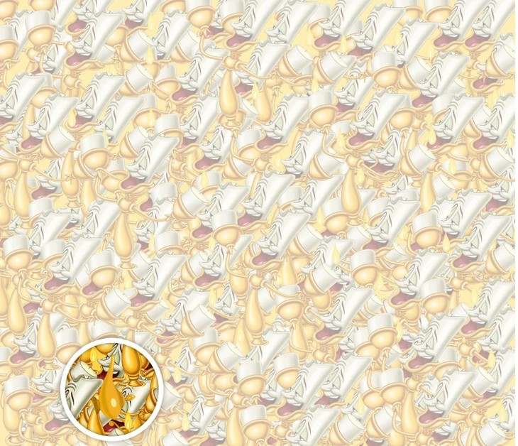 The Aladdin's lamp is at the bottom of the picture surrounded by Lumiere, a character in Disney's animated feature film, Beauty and the Beast. The image has left thousands of adults scratching their heads as they try to find Aladdin's lamp hidden in the image.