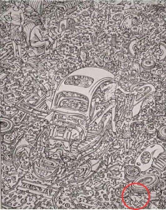 A vintage car is being assembled. It looks like an auto shop, heavily disorganised, with bolts, gears, wires, tires, and tools spread all over the place. But this auto shop makes a perfect hiding spot for a cat.