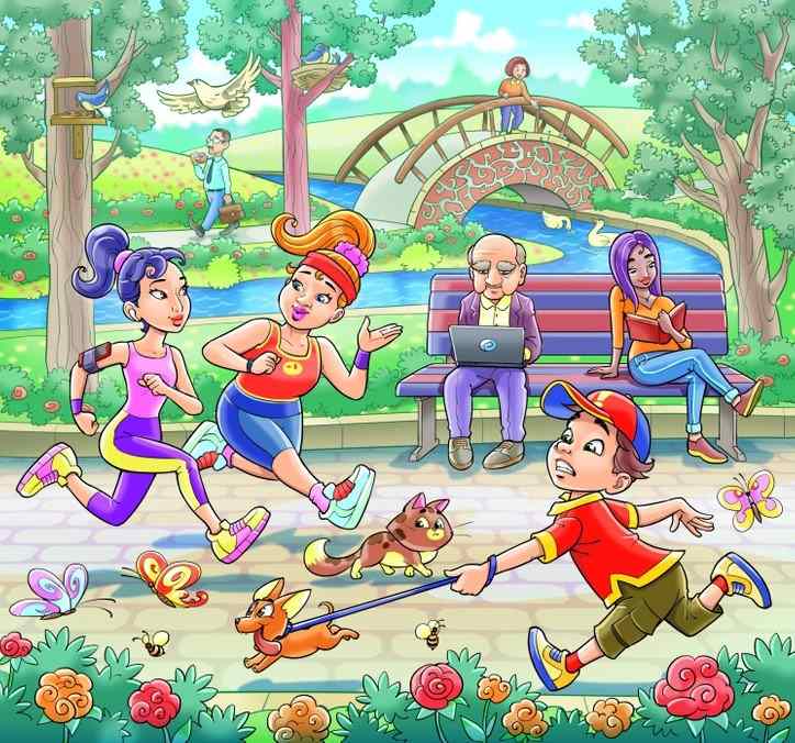 The above image is a tricky puzzle designed as a brain teaser to test the minds of children and adults. In this optical illusion picture, a snail is hiding inside a public park. In the image, you can see that a kid is running with his dog, two girls are jogging in the park, an old man is working on his laptop and a girl is reading a book on the bench. A woman is standing on the bridge and a man is strolling with his office bag. There are butterflies and beautiful flowers inside the park.