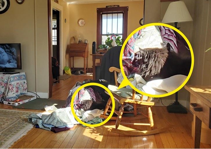 The above image was shared as a puzzle for the kids and adults to find a hidden cat resting inside the living room of the house. This optical illusion has made people scratch their heads due to its mind-boggling nature. In the image, you will see clothes scattered inside the living room of the house.