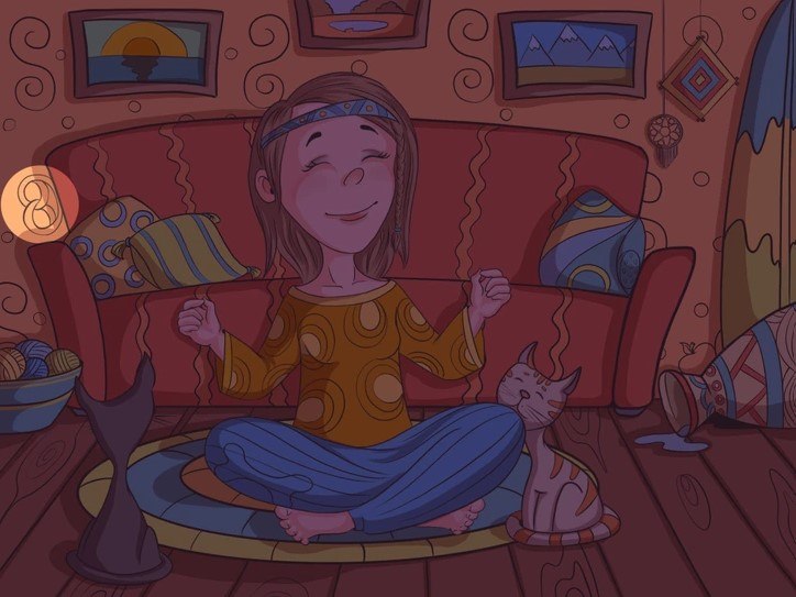 The above image was shared as a puzzle for both children as well as adults. The illusion challenges the viewers to find the pretzel in the girl's living room by asking “Find the hidden pretzel”. In this optical illusion image, you can see a girl's living room where photo frames are hanging on the wall. The girl is sitting on the floor of the living room with her two cats. Behind her, there is a couch, a spilled vase, and a bowl of yarns.