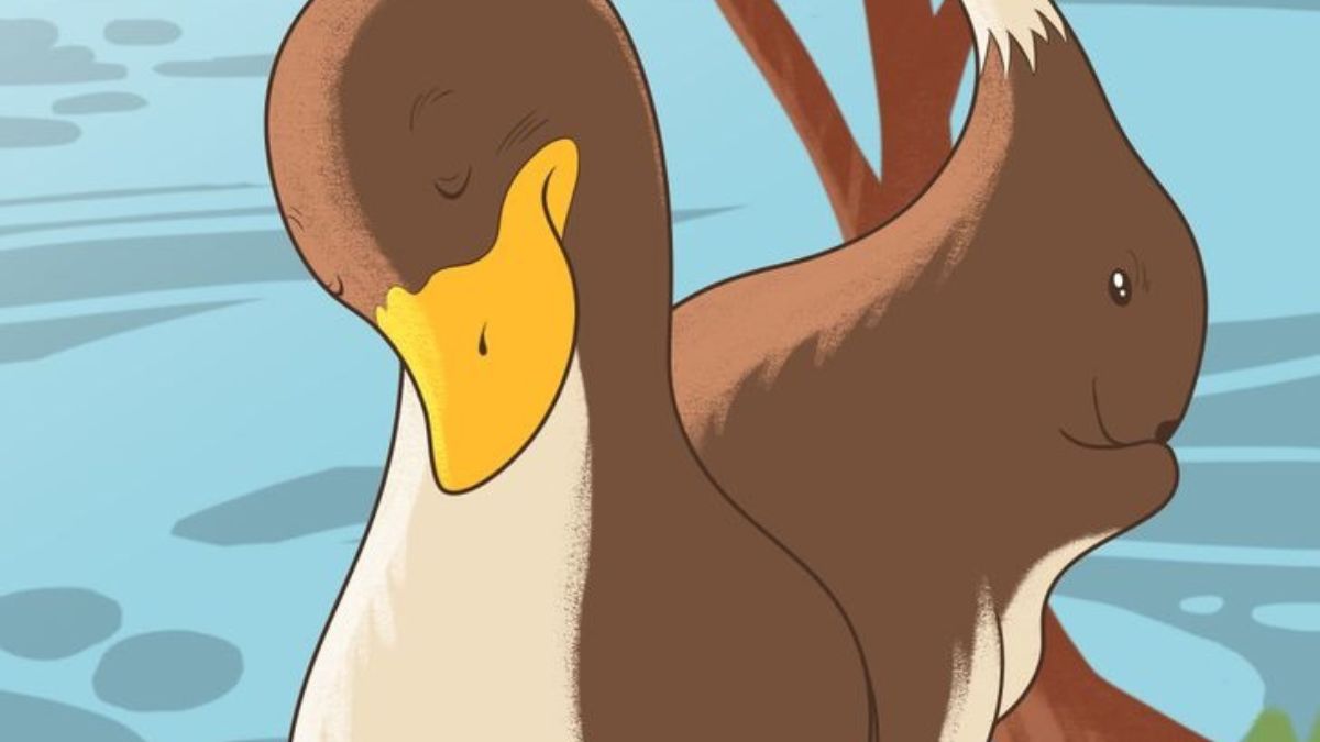 Behind the serene looking brown duck we can spot the mischievous looking squirrel.