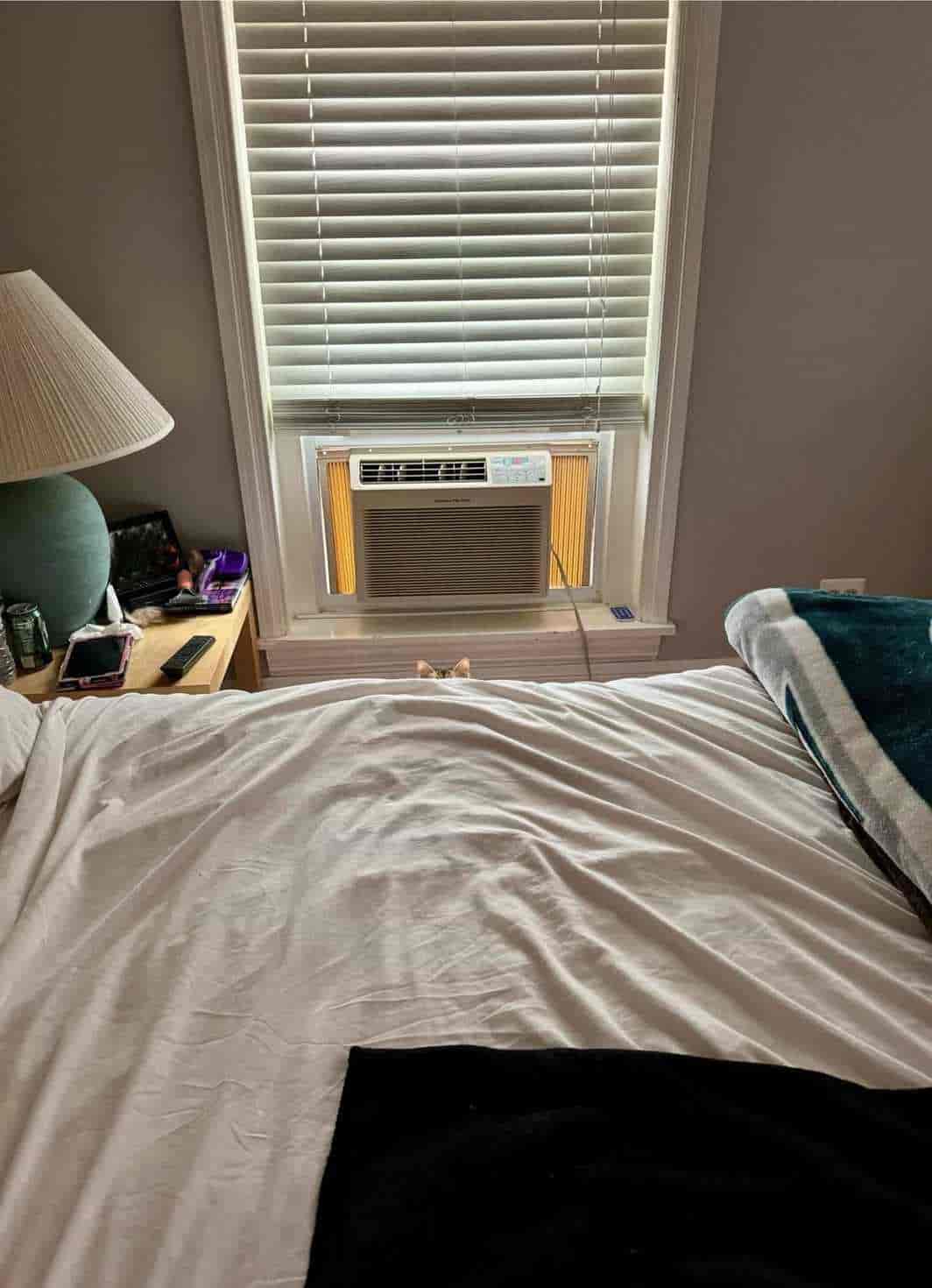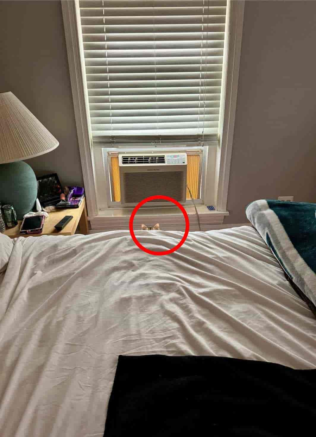 The hidden cat can be spotted right at the centre of the image, with its ears peeping out from the back of the bed.