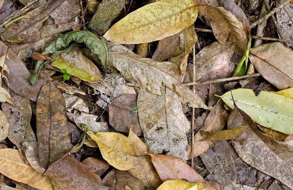 The image shared above depicts a forest scene in which scattered leaves can be seen spread across the forest floor.