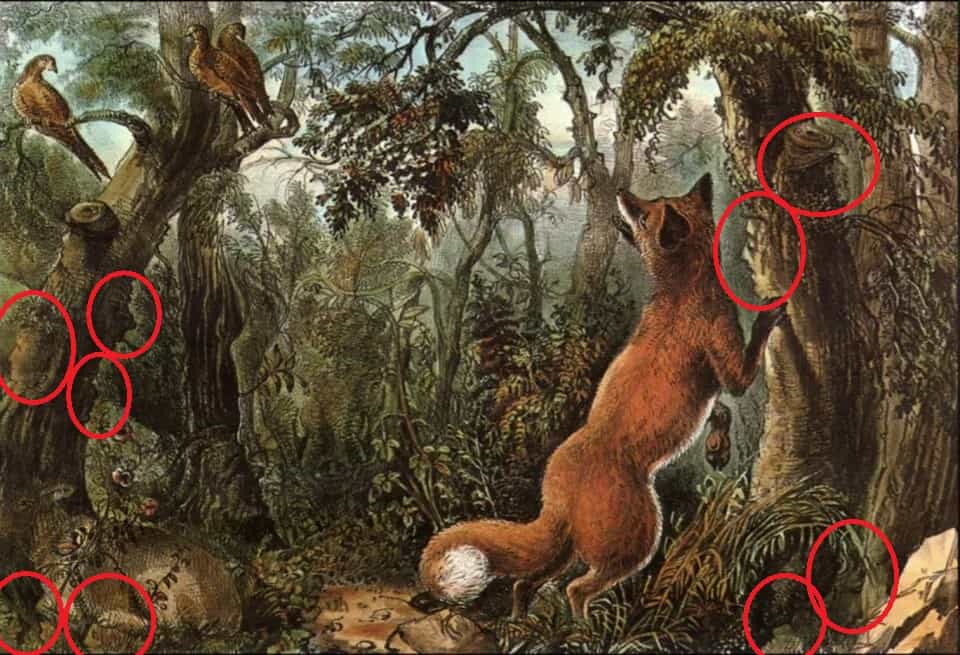 The human faces are scattered across the picture, while the most obvious outline of the face can be seen where the fox is resting its paws. Another face can be spotted at the back side of the same trunk.