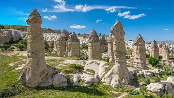 The Goreme National Park is a UNESCO world heritage site. Erosion there has created an unworldly landscape. The pillars as referred to by many, are thick volcanic creations having a thick tufa, topped by layers of basalt. Basalt has done the job of protecting the top layer in most places.