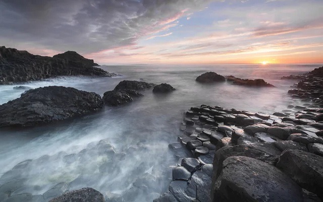 The place is called Giant's Causeway. It seems like land leading into the clouds or like a road to heaven. It is actually formed in the middle basaltic outpourings of the opening of the Atlantic Ocean. The hexagonal structures came from the slow cooling of the lava flows: as it cooled, it shrank, and just like hard dry soil, it formed hexagonal cracks. The finishing touch was given by erosion.