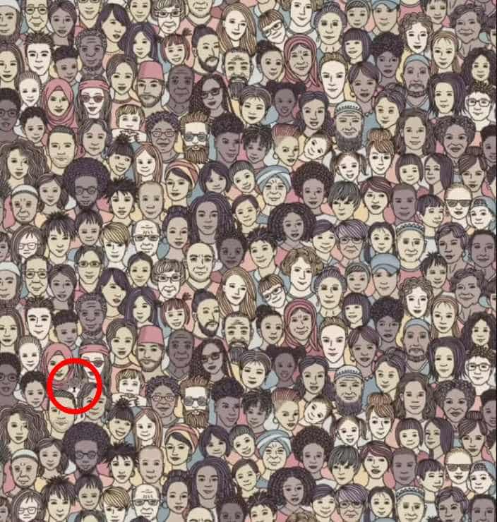As suggested by the title, there is a cat hiding among the humans in this optical illusion picture. The readers are tasked with finding the hidden cat in 9 seconds.