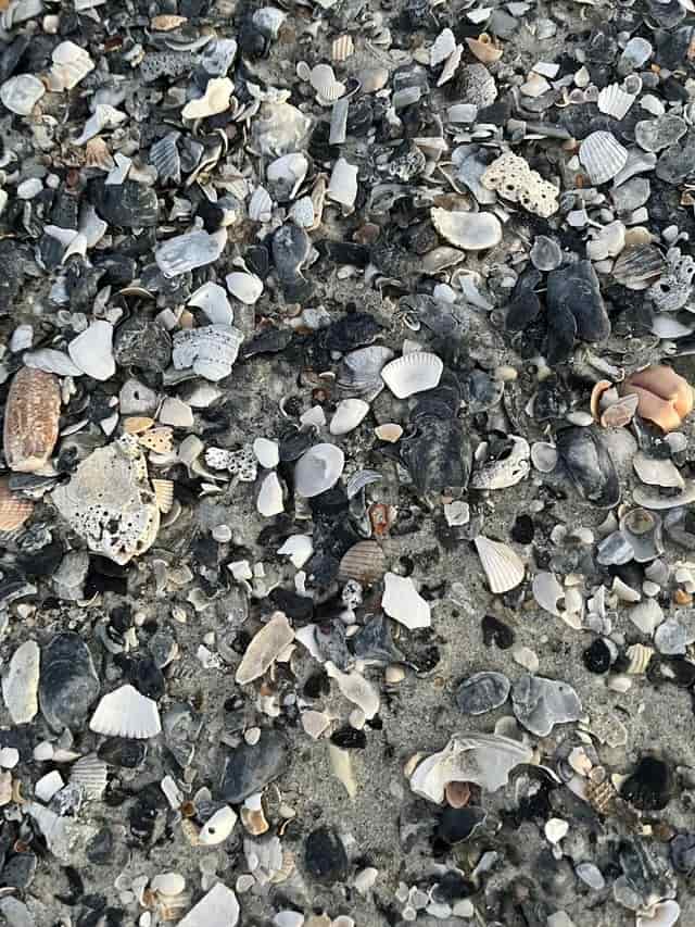 The image shared above shows a beach scene in which shells can be seen scattered all over the place.