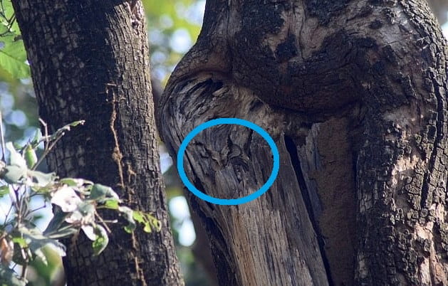 The owl can be spotted resting on the tree with its neck turned towards the camera. The colour of the tree bark and the owl is almost the same, making it difficult to recognize the presence of an owl at first.