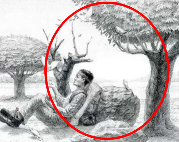 The hidden horse can be seen as an outline in the empty space between the tree and the rock, with the bag of the man forming one leg and a bird forming the horse’s ears.
