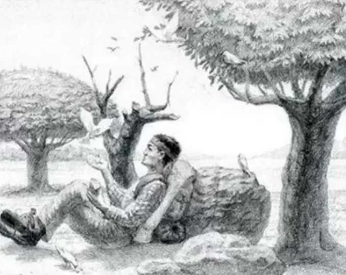 In this image, a man can be seen sitting under a tree and feeding the birds.