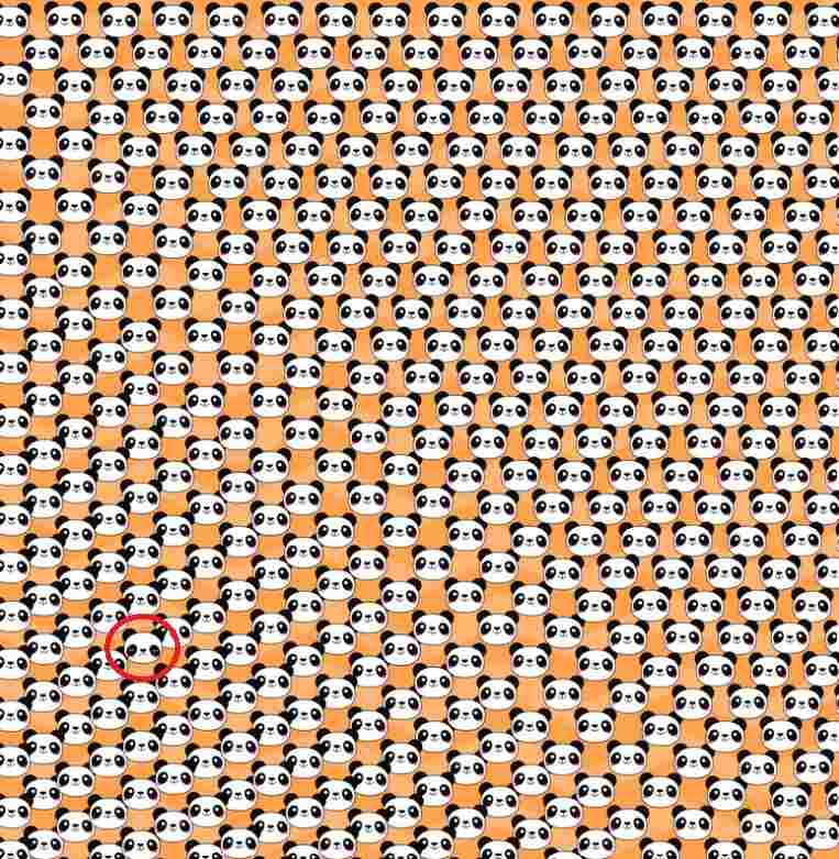 Take a close look at this tricky puzzle and try to spot the hidden sad panda between the black and white pandas. It may appear too tricky to spot the sad panda, but if you look at the bottom left side of the image then you will be able to spot the hidden panda which has a different expression than the others. The odd panda has sad eyes and a down face. For your ease, we have highlighted the hidden sad panda in the image given below: