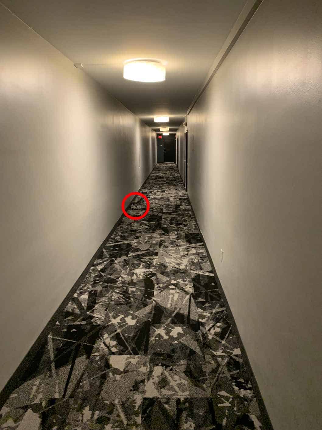 The cat can be spotted at the left side of the hallway, it’s fur colour blends with the floor making it difficult to detect at first glance.