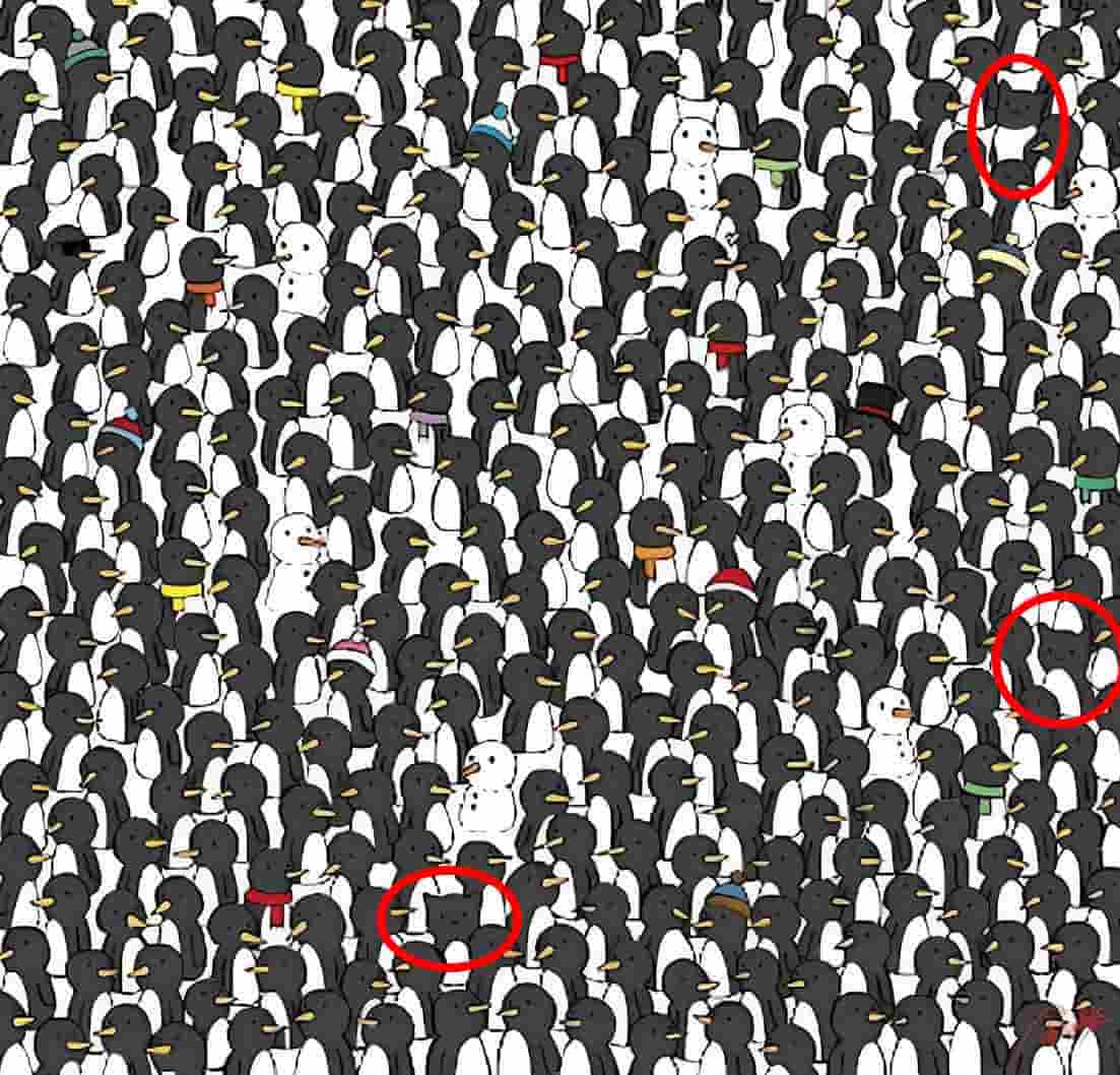 Optical Illusion to Test Your Vision: Find 3 Cats Among Penguins in 10 Seconds