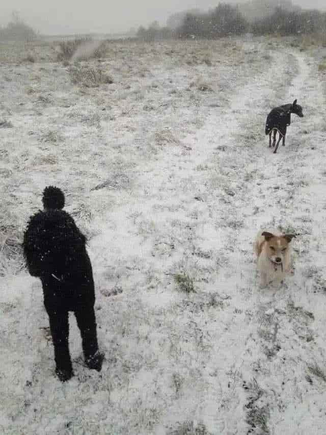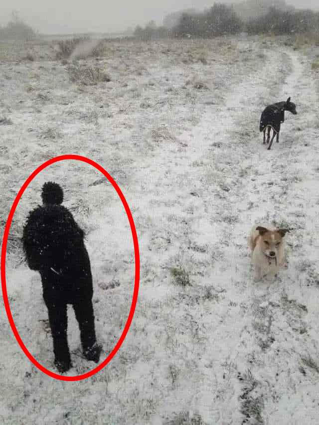 The dog can be seen on the left side of the image, at first glance it looks like a person is standing wearing a black fur jacket, but it is in fact the third dog.