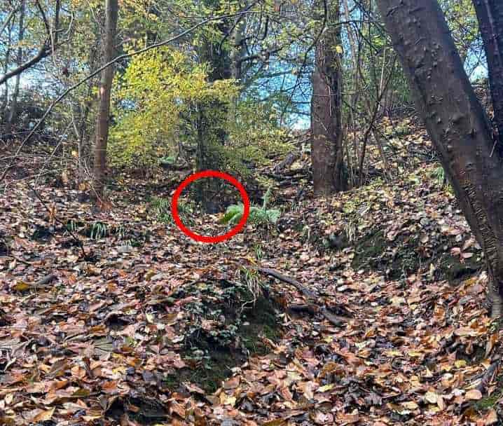 The dog is a black labrador and it is hiding under the base of tree located a little away from the centre of the image.