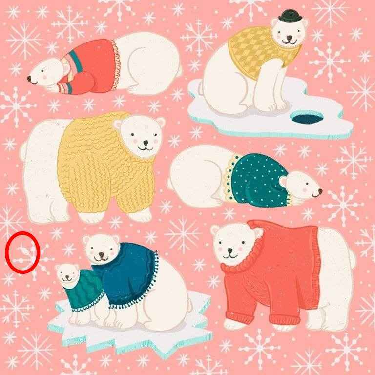 As the title suggests, there is a hidden fish among the polar bears in this picture.