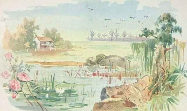 In the image shared above, a painting can be seen of a idyllic village with a pond.