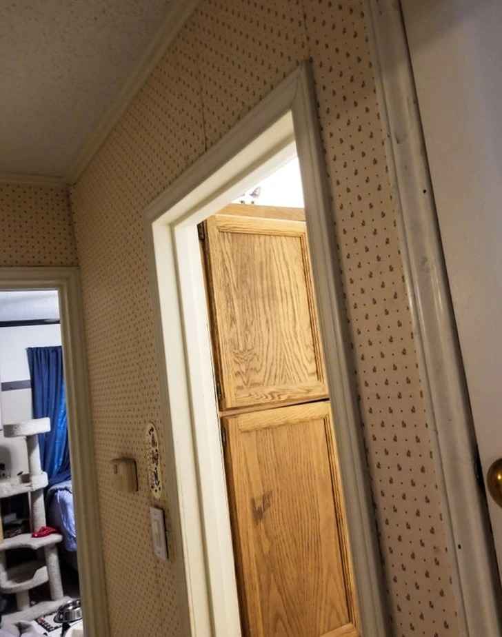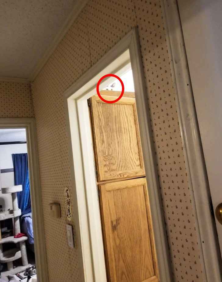 The cat be seen at the top of the door. It is a white cat with only its face visible.