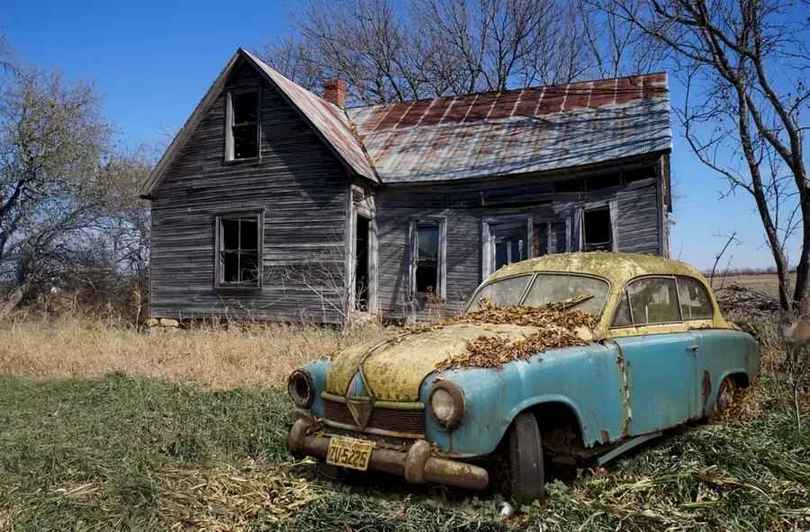 In the image shared above, an old car can be seen against the backdrop of a abandoned cottage.