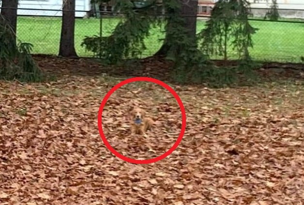 The dog has blended in with the fallen leaves, making it difficult to spot.