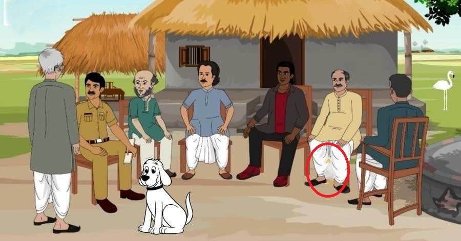 The image shared above depicts an outdoor village scene where village people are conducting a meeting. You can also see a crane and a dog in the picture.