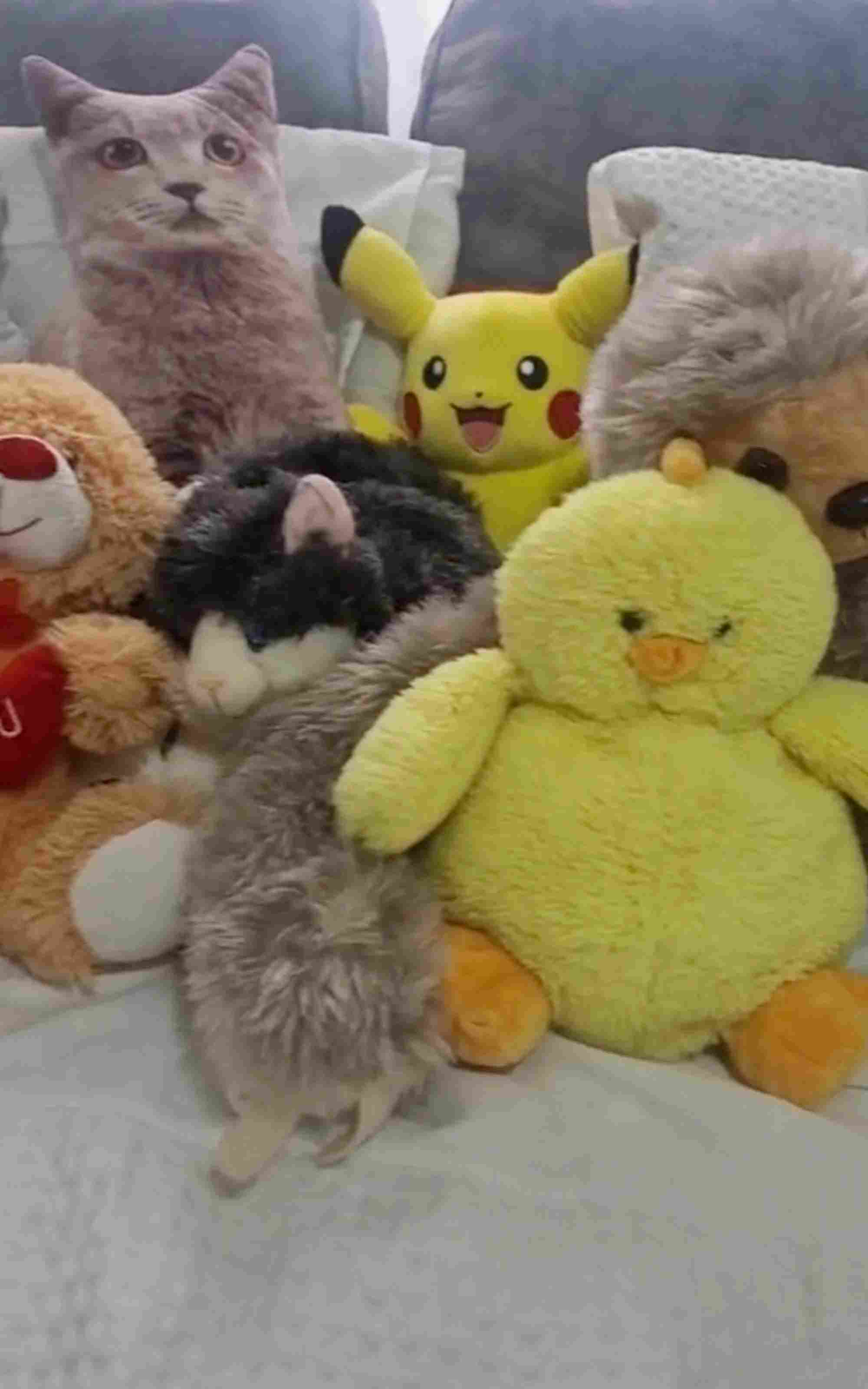 This image was shared by Gosia, who is a TikTok user and has five cats as her pet. In this image you can see a bed is filled with stuffed toys of different types which include ducks, cat, teddy bear and the endearing Pikachoo.
