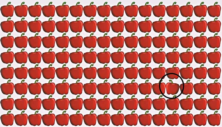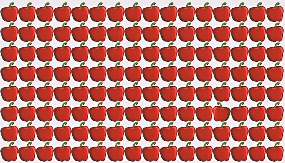 Hidden among these red bell peppers is one bell pepper which is different from the rest. Your task is to spot the odd bell pepper in 4 seconds.