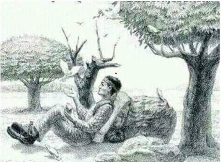 In this historical optical illusion picture, you can see the landscape of a forest. A man can be seen sitting on the forest floor, and there are trees around him. Apart from the man and the trees, there is also an animal hidden in this forest.