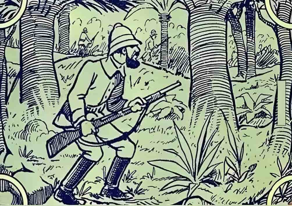 The vintage image shared above depicts a jungle scene in which a group of rifle-wielding hunters can be seen searching for something, most likely an animal.